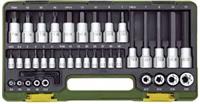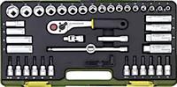 -) جعبه بکس 56 پارچه شامل بکس، دو عدد دسته جغجغه 1/2" و 1/4" ،آچار شمع ،بکس لغلغی، کمکهای کوتاه و بلند کشویی، آلن و سری پیچ گوشتی چهارسو، آلن و ستاره بکسی.