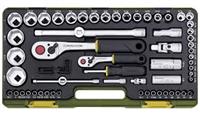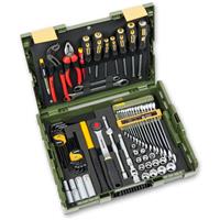 -) جعبه آچار 50 پارچه شامل ست بکس، دسته جغجغه 1/2" ،آچار شمع ،بکس لغلغی، کمکهای کوتاه و بلندکشویی ، آلن های چاقویی و ست پیچ گوشتی چهارسو و دوسو، چکش 300 گرمی با دسته گرافیتی، آچارکلاغی و انبردست Knipex آلمان و فازمتر.